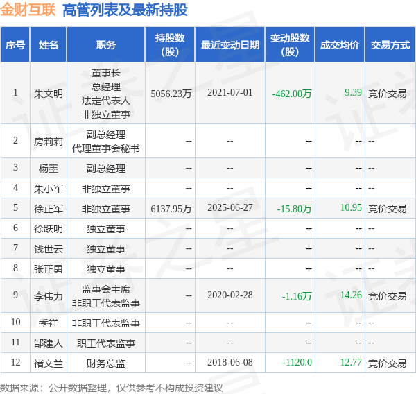 金财互联的高管列表及最新持股情况如下: