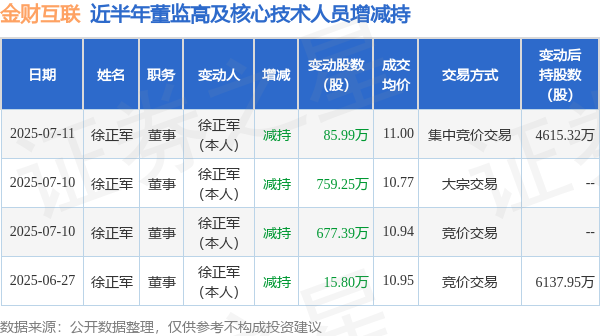 金财互联近半年内的董监高及核心技术人员增减持详情如下: